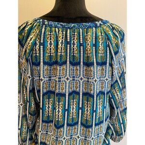 FIGUEROA & Flower Blouse Sz Large Boho Peasant Elastic Waist Blue Green Top