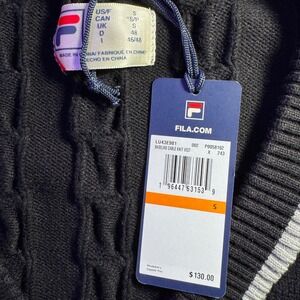 Keywords: FILA vest, mens sweater vest, cable knit vest, black vest, sleeveless sweater, FILA Baseline, mens knit vest, small vest, retro sweater, athletic vest, tennis vest, golf vest, preppy vest, collegiate style