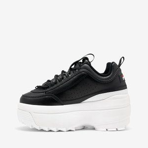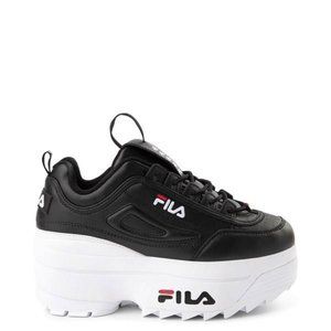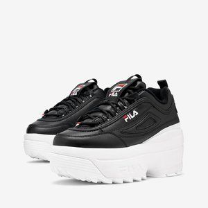 These sneakers from Fila features a lightweight EVA embossed and embroidered logo hits on tongue; quarter; back counter; and midsole reflective eyerow detailing double stacked wedge midsole pull tab at the rear a round toe platform sole a rudged rubber sole and a branded insole.