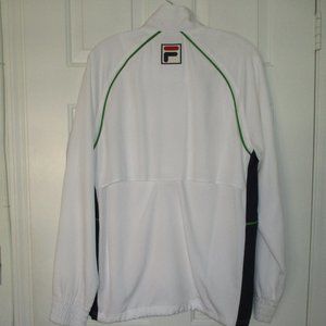 FILA Mens L/S BNP Paribas Open Full Zip White Tennis Windbreaker. Mesh Lining & Vented Back. Twin Zippered Pockets & Drawstring Waist. Size 3XL. Armpit-to-armpit 28", Length 31". 100% Polyester in White w/ Lime Green Piping. New w/o Tags, suitable for gifting.