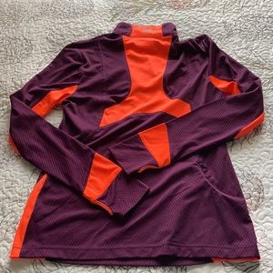 Sporty athletic zip by FILA. Awesome running / workout top, breathable material, long sleeves with thumb holes, hidden pocket on back side for keys etc. Color is plum purple and electric orange. Great condition. Size XS.
