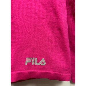 The shirt also has thumbholes and is tagless for added comfort, with accents of the FILA logo. The size is a women's large, and the shirt is machine washable for easy care. This colorful, athletic top is perfect for a variety of activities such as running, hiking, or even just everyday wear.