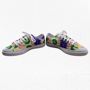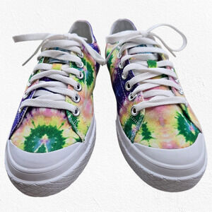 Vibrant tie-dye print in green, purple, yellow, and pink on classic low-top canvas sneakers