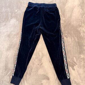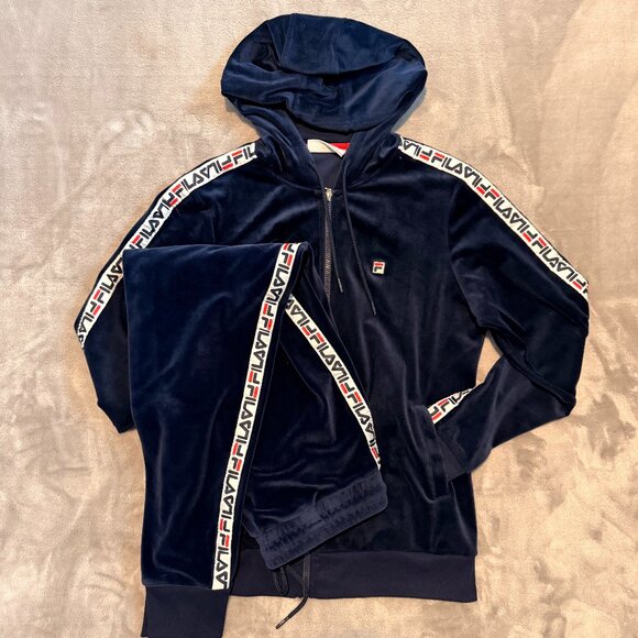 FILA Velour Track Suit Set Navy Blue Logo Tape Hoodie Joggers L/M