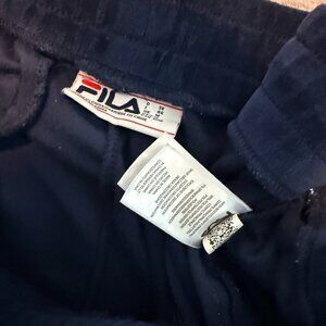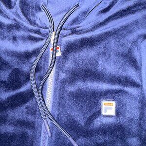 FILA two-piece velour track set in a rich navy blue color featuring signature FILA logo tape down the sleeves and pant legs. The jacket is a full-zip hoodie with front pockets, while the matching pants are jogger-style with an elastic waistband and cuffed hems. Soft velour fabric offers a comfortable, elevated athleisure look perfect for casual wear or lounging.