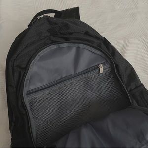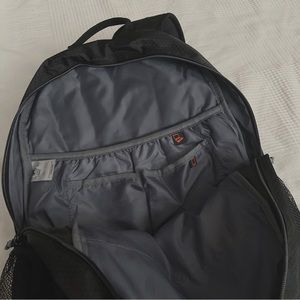 never used, fits 16in macbook, nylon techy-fabric, three main zipper compartments with additional pockets, water bottle pockets on both sides