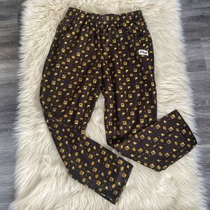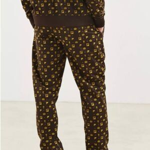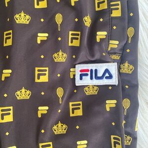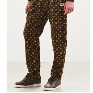 Fila Monogram Track Pants Size XL Brown NWT. Pull on Silhouette. Slim Cut . Slightly tapered leg . Zip accents at hem . Elastic waist. Front slant pockets. Woven logo Label at left thigh . Waist 20-21 inches seam to seam with stretch applied. Total length 42”. 100% Polyester