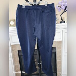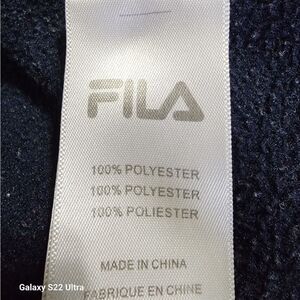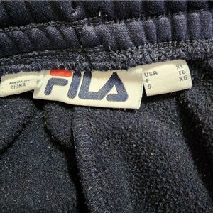 Men's Navy Blue Sweatpants by FILA. There are 2 pockets in the front, and one pocket in the back that's functional. There is a drawstring in the front to adjust to your size. The fabric is thick and soft.