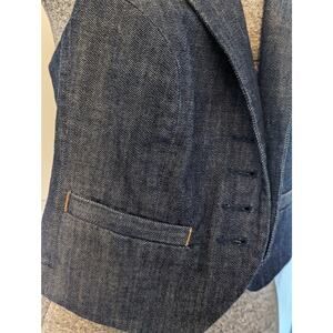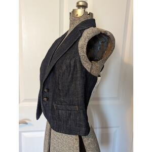FILLMORE denim vest including denim collar and lapel & pinstriped back detailing & buckle. 2 front slit Pockets, buckle detail on back. 4 button holes - only 2 buttons remaining. Hand Tooled Garment.