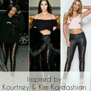 Celeb style alert! Inspired by Kourtney and Kim Kardashian, these leggings are A-list style. These leggings give a faux leather/wet look with corset style lace up the center leg and silver grommet hardware. Size small (2-6), medium (6-10) to large (10-14)