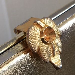 This is a Ladies’ Gold-tone Bag that can be used as either a handbag or a clutch. The closure is missing a stone. Crudely measured, the bag is 9” L x 1-3/4” W x 5” H. Please also not there are some marks on this item none which affect usability