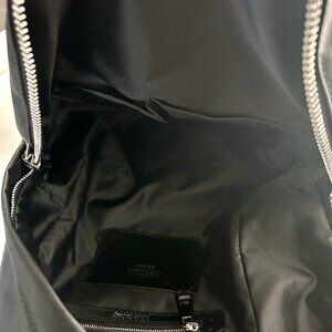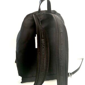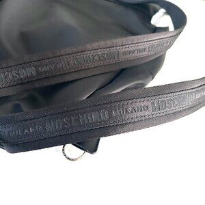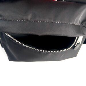 This lightweight but hardy UNISEX Moschino Mickey Rat Patch nylon with leather trim backpack is perfect for men, women and could withstand boys and teens. Top leather handle, logo'd adjustable padded shoulder straps, silver tone hardware. Industrial sized top double zip closure with large logo pulls, opens to a quite roomy main compartment with one zipped wall pocket and 2 slip pockets. A big plus is a large exterior zip compartment at front for easy access to essentials. Measurements taken by hand - width does not include front pocket which is 2" deep. Minute signs of wear from storage. Sold out most everywhere. No offers, please.