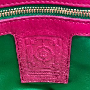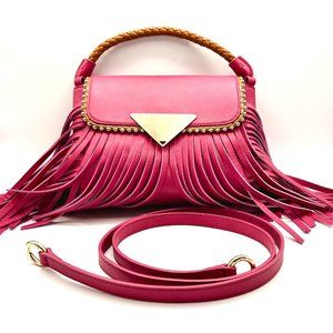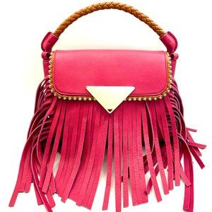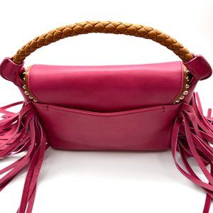 RARE. This fabulous Sara Battaglia Bag is giving festival joy in fuschia/hot pink leather. Features rolled woven leather handle in tan, detachable strap, soft gold toned hardware, studs all around tan leather trim on flap and loads of fringe. Flap magnetic closure opens to roomy fully lined in bright green satiny fabric interior with one zipped wall pocket. Exterior slip pocket at back. Strap length (end to end) 43". Woven handle drop: 2.5". Tote it, clutch it or wear it across the body. Never carried. Minute to negligible signs of wear from handling and storage. Please examine photos closely as they are part of the description. No box, no dust bag. FINAL DROP at $400. NO OFFERS, please.