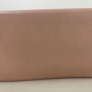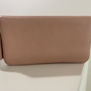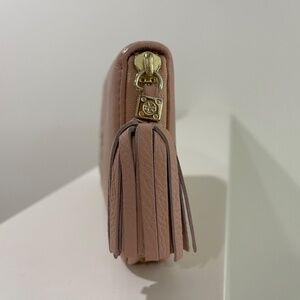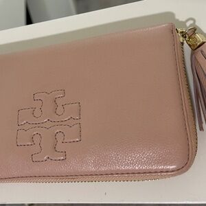 Tory Burch soft leather zip wallet with tassel in color pink. There are some indentations (please see pictures). Otherwise, it is in great condition.
