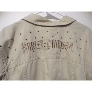 This Harley Davidson cropped jacket is a stylish and versatile addition to any woman's wardrobe. Made from durable cotton denim, it features a solid beige color with studded accents and embroidered logo detailing. The jacket has a button closure, long sleeves, and a regular fit, making it perfect for travel, casual outings, or workwear. With a touch of biker and motorcycle vibes, this jacket embodies a 90s-inspired look that is both edgy and classic. Perfect for the fall and spring seasons, this Harley Davidson jacket is a must-have for any biker or motorcycle enthusiast.