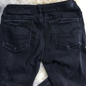 Light black color, distressed in front and also on back pockets, gently used good condition!