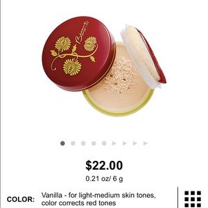 Shade is Vanilla. It's more of a translucent powder with a yellow tint to it. Powder was used less than 5 times. Sephora website recommends it for light to medium skin tones. PS: selling because I have a ton of setting powder and rarely reach for it + the shade is not my skin tone friendly if used all over the face.