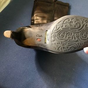 Black heeled leather boots by Clarks. Patent leather accents including buckle at ankle. Boot is 15” tall plus 3” heel. Size 9.5. Some wear including damage on the heels as can bee seen in the photos.