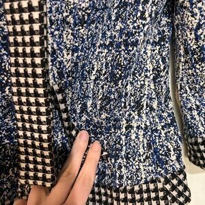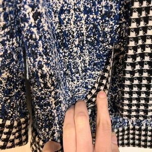 Excellent used condition 3/4 length sleeves Deep circle neckline with black and white checked trim with ties. Slash pockets at hips Shoulder pads
