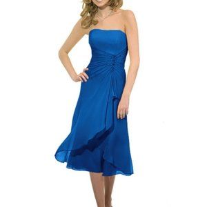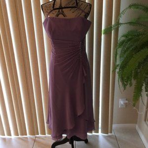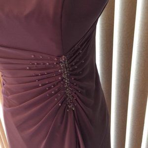 Boysenberry, chiffon, strapless (optional spaghetti straps), Straight neckline, boning sewn into bodice, pleating toward one side adorn with embellishments, zipper back, flowing A-Line skirt, lined, elegant formal dress, perfect for prom or any special occasion. Matching bolero jacket included.