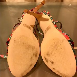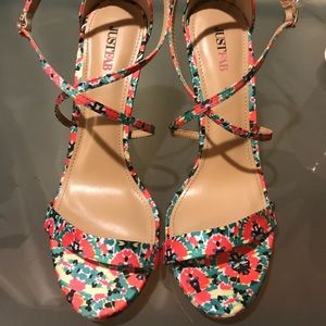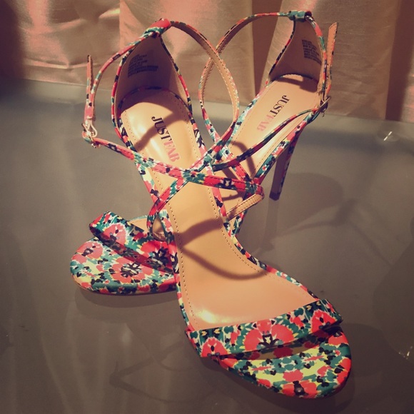 NWOT- tried on twice- bright and colorful, these strappy heeled sandals would be perfect for spring break. By JustFab. No wear on the inside or heels, only wear on sole is from walking around inside while trying on. Size 8. Would probably fit sizes 7.5 and 8 comfortably. Offers and bundles always welcome!💗