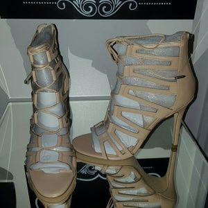 Brand new Ivanka Trump Hallee Strappy sandals with original box, leather upper with round leather ghillie ties, zip closure in the back, open toe, man-made lining, man- made footbed, covered stiletto heel stem, synthetic outsole, heel height: 4 inches, shaft: 5 -3/4, color: light brown. No trades.👠 ALL REASONABLE OFFERS ACCEPTED👠