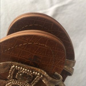 Pre-loved but in excellent shape. Sole does show wear, but sandal's body is in excellent condition. Slight wedge style heel. Snake print pattern, vegan leatherette. Seed beads and rhinestones. Color is like bronze. Size 6.5M