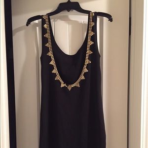 Beautiful black dress with scoop low cut back and gold embellishments around the front and back! Just a couple beads missing around the trim in the back and one in front but not really noticeable! Very sexy and you can paint the whole town red with this one! Fabric has stretch! No PP, no Trades and no low balling! Price is firm!