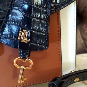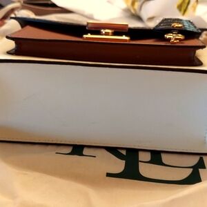 Gorgeous three color bag, handbag/satchel, well constructed, brand new with tags. Crocodile embossed and detachable/adjustable chain strap, gold hardware, front outside pocket, back pocket, inside zipper pocket, very roomy yet compact, super classic and very versatile color scheme. Key charm/luggage tag. Very classy, elegant bag. Dust bag included. Adjustable strap. Color's; black, light tan and vanilla. 9.5" X 8" X 3.25" depth. FIRM PRICE.