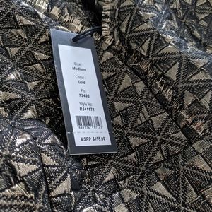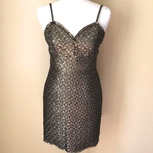 Stunning gold metallic shimmery dress. All over texturized fabric I'm geometrical shapes and raw edge hem. This dress is perfect for any fancy event!