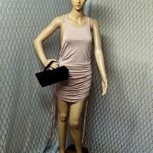 This curve-hugging sexy summer dress has a racer-back and adjustable side ruching. It can be made as long or as short as you'd like it to be; or asymmetrical if you choose! The more curves you have, the more dangerous this dress is! New, never worn, never washed, no flaws, no tags.