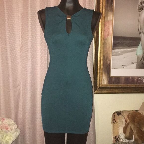 NWOT. This is a beautiful, green, form fitting dress. It has gold accents and does have some stretch to it. It features a key hole in front with a gold metal accent. It measures 16 inches at the hip and 31 inches in length. Please refer to photos for full description. Please inspect pictures carefully and use zoom feature. Machine wash cold. Sold as is. No returns. No offers accepted