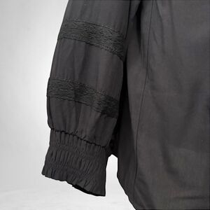 Beautiful, lightweight black peasant blouse. Boutique brand; Find Me Plus has split neckline with ties and tassles. Long sleeves with lace accents and smocked wrists. Non Stretch woven fabric made of 50% Moder/50% Tencel
