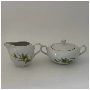 FINE CHINA OF JAPAN, CREAMER & SUGAR BOWL W/LID, WHITE WITH PINK, GREEN & BROWN LEAVES