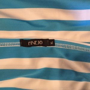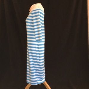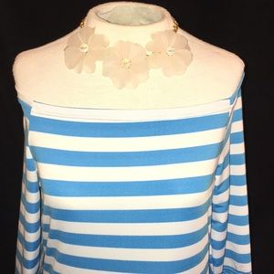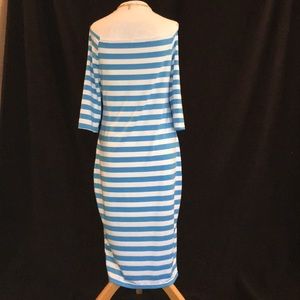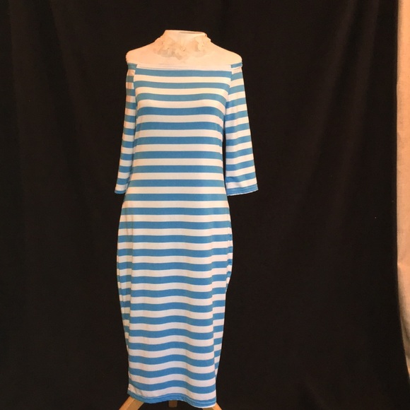 Adorable off the shoulder teal and white stripe summer dress. 3/4 sleeves 14", neck opening 16 layer flat, chest 17", dress length 37". Stretch - polyester?Flips or heels, easy throw on dress! NWOT