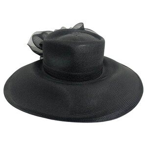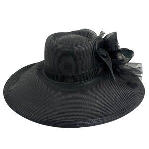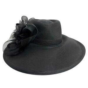 FINE MILLINERY Black Wide Brim Church Derby Hat With Floral Accent + Mesh Bow