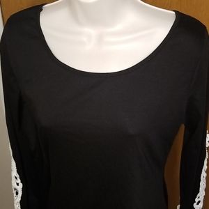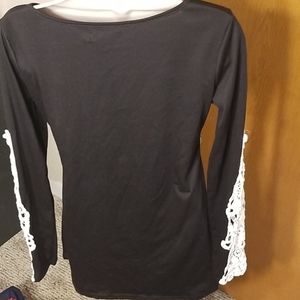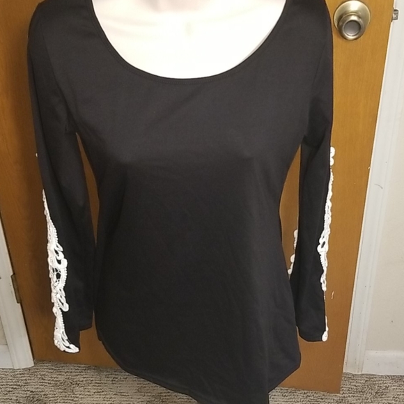 Black long sleeve top rounded neck in this is a longer time period on the sleeves it has white Crocheted lace Korea super cute top and super soft