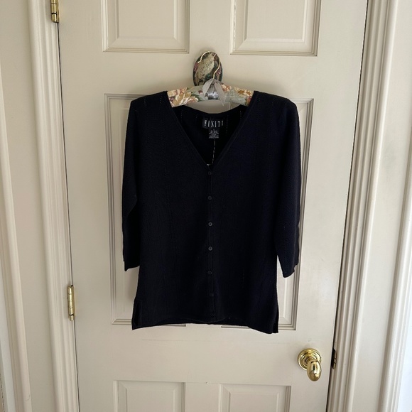 Tiny 5/8" black buttons. Fabric content is 55% rayon and 45% cotton...dry cleaning is suggested. The sweater measures 22" center back to hem, underarm to underarm is 18" and the three quarter sleeves measure 10" underarm to hem. There's a nice vertical woven pattern that I tried to capture with my phone. The sweater is a TRUE BLACK.