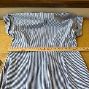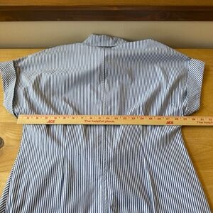 Womens size Large, blue and white striped pattern, button front, shirtdress style, cotton spandex, midi length, short dolman sleeves, A-Line silhouette, tie waist.