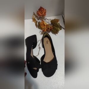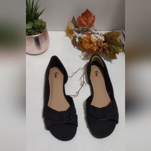 Chic black flats with open-toe design. Features a stylish bow accent. Ideal for casual wear.