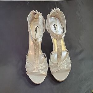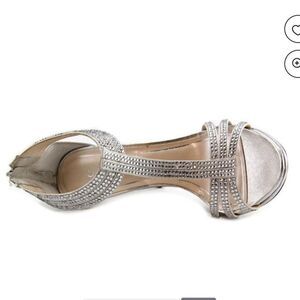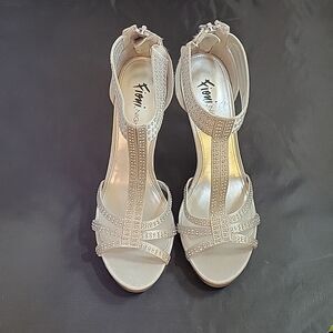 FIONI NIGHT WOMEN"S SATIN STILETTOS HEEL PEEP TOE PLASFORM RHINESTONES SANDAL SIZE 9 COLOR SILVER & GRAY MADE WITH FABRIC UPPER BALANCE MAN MADE MATERIALS DESSUS TISSUE AUTRES SYNTHETIQUES HEEL HEIGHT MEASUREMENTS APPROX 4"INCHED THIS ITEMS IS PRE-OWNED EXCELLENT CONDITION WITH ONLY LIGHT SIGNS OF WEAR IF ANY CHECK THE PICTURES