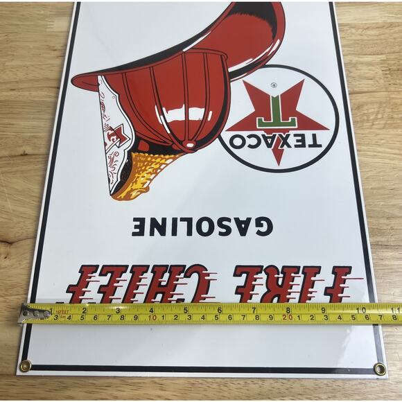 FIRE CHIEF ~ "GASOLINE TEXACO" ~ 1986 Ande Rooney Porcelain Advertising Sign