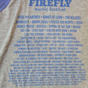 For sale is a Firefly Festival t-shirt. It is in excellent used condition with no major signs of wear, but is missing the size and material tag. This gray shirt is baseball style with blue 3/4 length sleeves. It has the logo for the 2015 Firefly Music Festival, held at The Woodlands in Dover, Delaware. The back has the line-up and bands and artists that were performing, including Paul McCartney, Kings of Leon, The Killers, Morrissey. Snoop Dogg and more. For people that like band and concert shirts. Size xx-large or 2X (guessed), approximate measurements: chest- 50", waist- 48", length from armpit to bottom- 17.5", sleeve inseam- 14".
