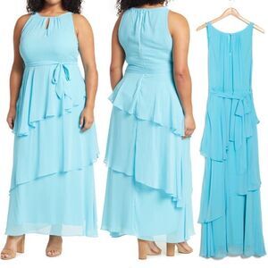 •Brand New• Tahari Keyhole Tiered Chiffon Aqua Fully Lined Maxi Dress