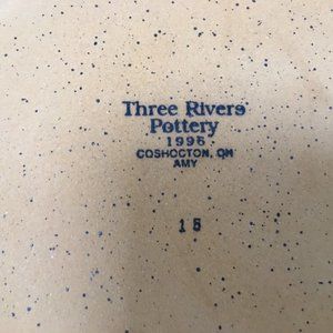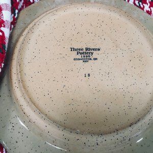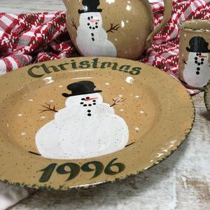 This is a great Christmas plate to go with your collection of Three Rivers Pottery! I love this hand-painted snowman against tan speckled background with white snow and green sponged rim.