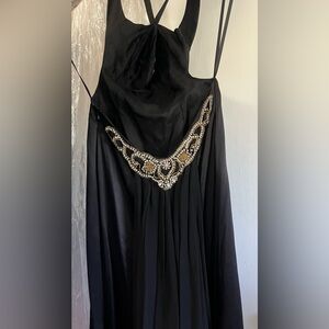 EUVC Jovani size 2 100% silk black gown! Another🤩! The beading is exquisite on the cups and the lower back of the dress which also has a chiffon detail/train! This dress is backless but has criss cross straps and a fun front slit! One piece of back decor is coming unstitched slightly (pics) as is label is for some reason and one hanger strap is attached by safety pin.
