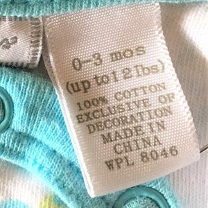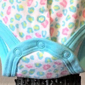 Couldn't be cuter, or easier to get into! 4-snap front, 3-snap bottom. Pink, Turquoise and Green "animal" print, accented with 3 big beautiful girly ribbon bows!