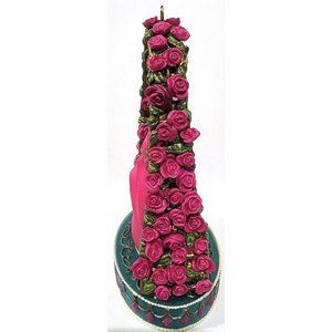 Jackie Kennedy in fuchsia & white gown under an arch of roses.