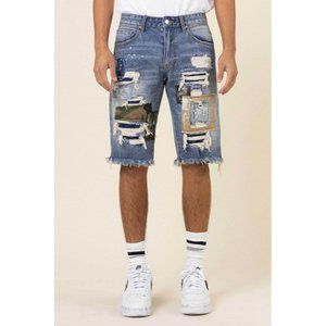 FIRST ROW CASUAL PANTS SHORT SUMER CAMO&TWILL PATCHED RIP&REPAIRED DENIM SHORTS