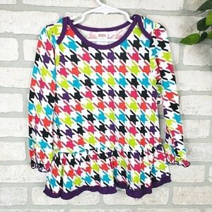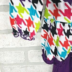 FISHER-PRICE Matching Set Shirt & Pants Size 4T. The top has a colorful geometric pattern throughout with bottom ruffles and elastic cuffs on sleeves with matching solid purple pants. Excellent condition. *New*